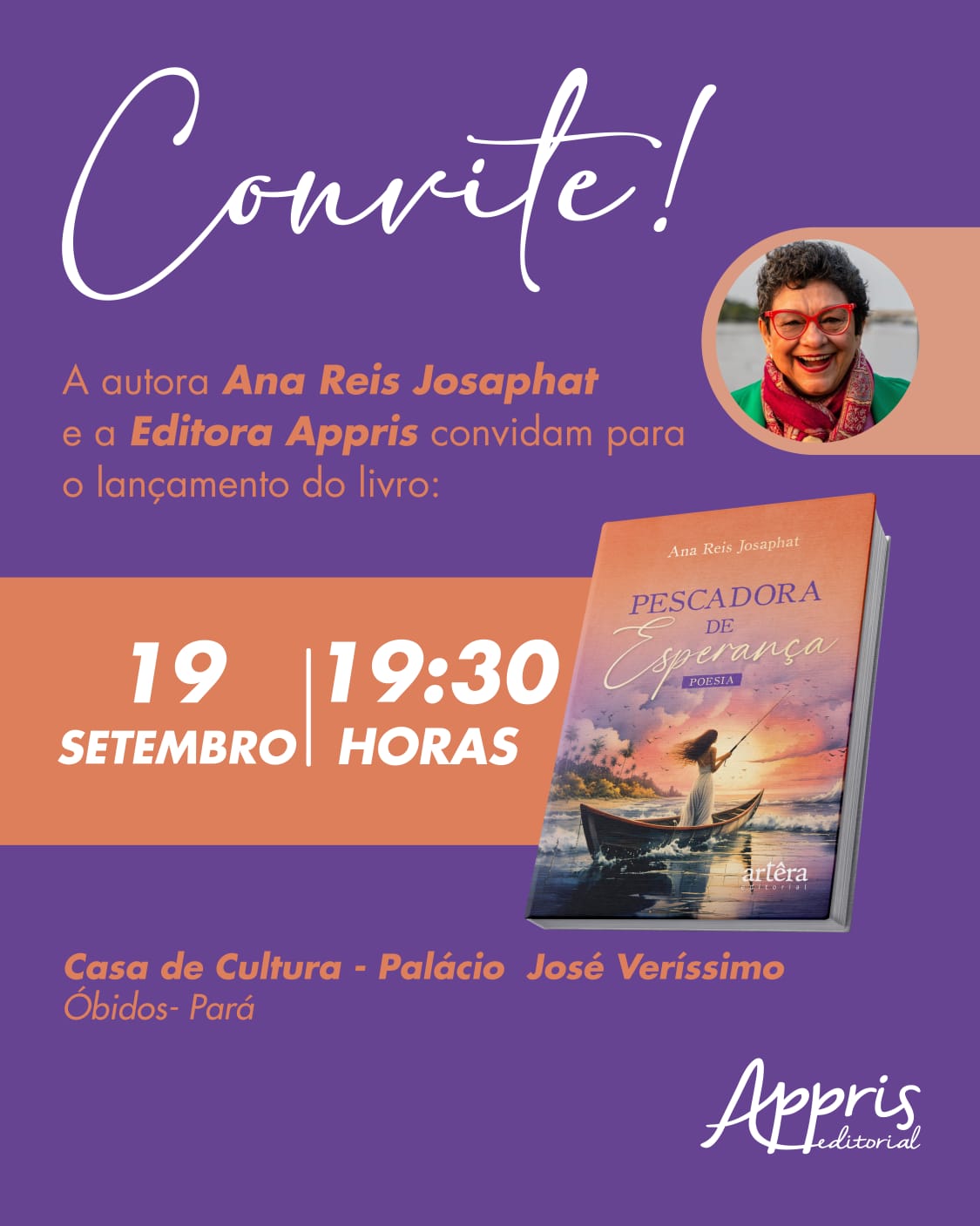 No dia 19 de setembro, em Óbidos, haverá o lançamento do Livro de Poesia “Pescadora de Esperança” da obidense Ana Reis Josaphat. O acontecimento será na Casa de Cultura – Palácio José Veríssimo a partir das 19:30 horas. O livro tem assinatura da editora Appris e é um deleite para os amantes da boa poesia.