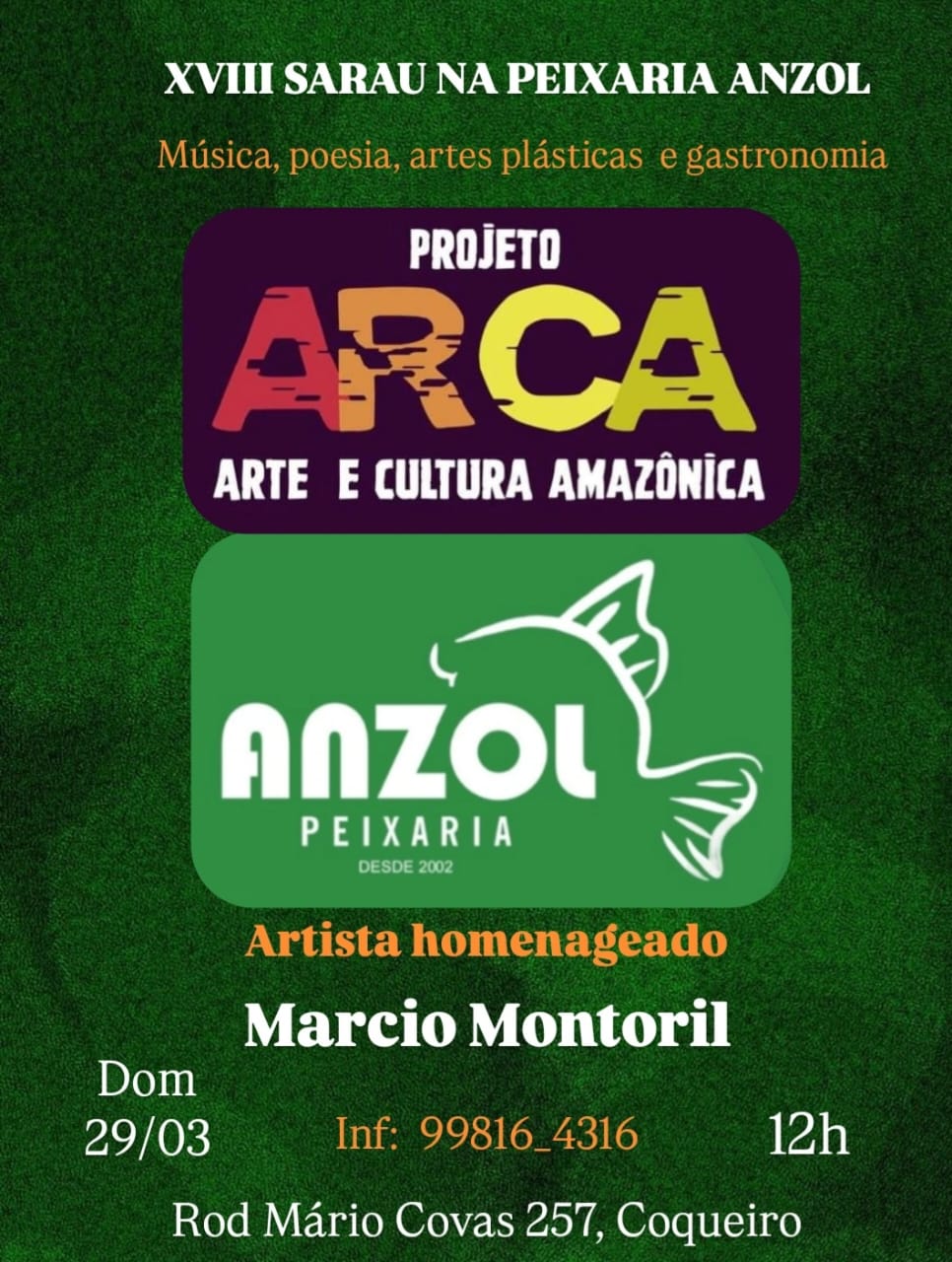 O Projeto ARCA (Arte e Cultura Amazônica) reúne músicos, poetas, cantores e cantoras e todas as pessoas que gostam de arte. E no domingo (29/03) estará realizando seu XVIII SARAU na aconchegante Peixaria Anzol.